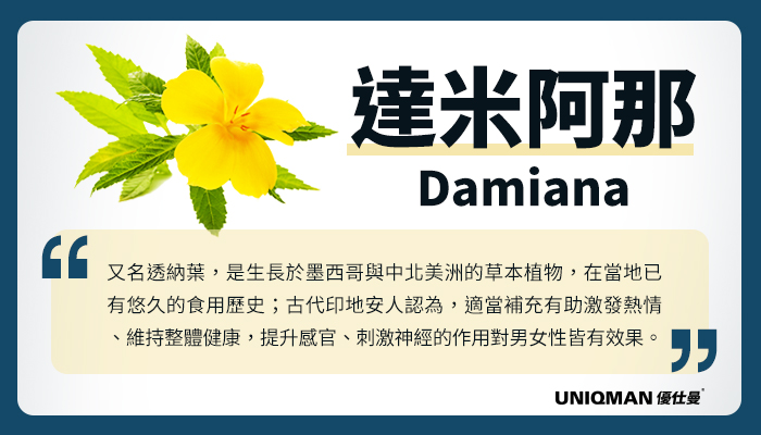 達米阿那(Damiana),又名透納葉,是生長於墨西哥與中北美洲的草本植物,達米阿那含有多種化合物,如熊果苷、松果苷等,在當地已有悠久的食用歷史;古代印地安人認為,適當補充有助激發熱情、維持整體健康,其提升感官、刺激神經的作用對男女性皆有效果。