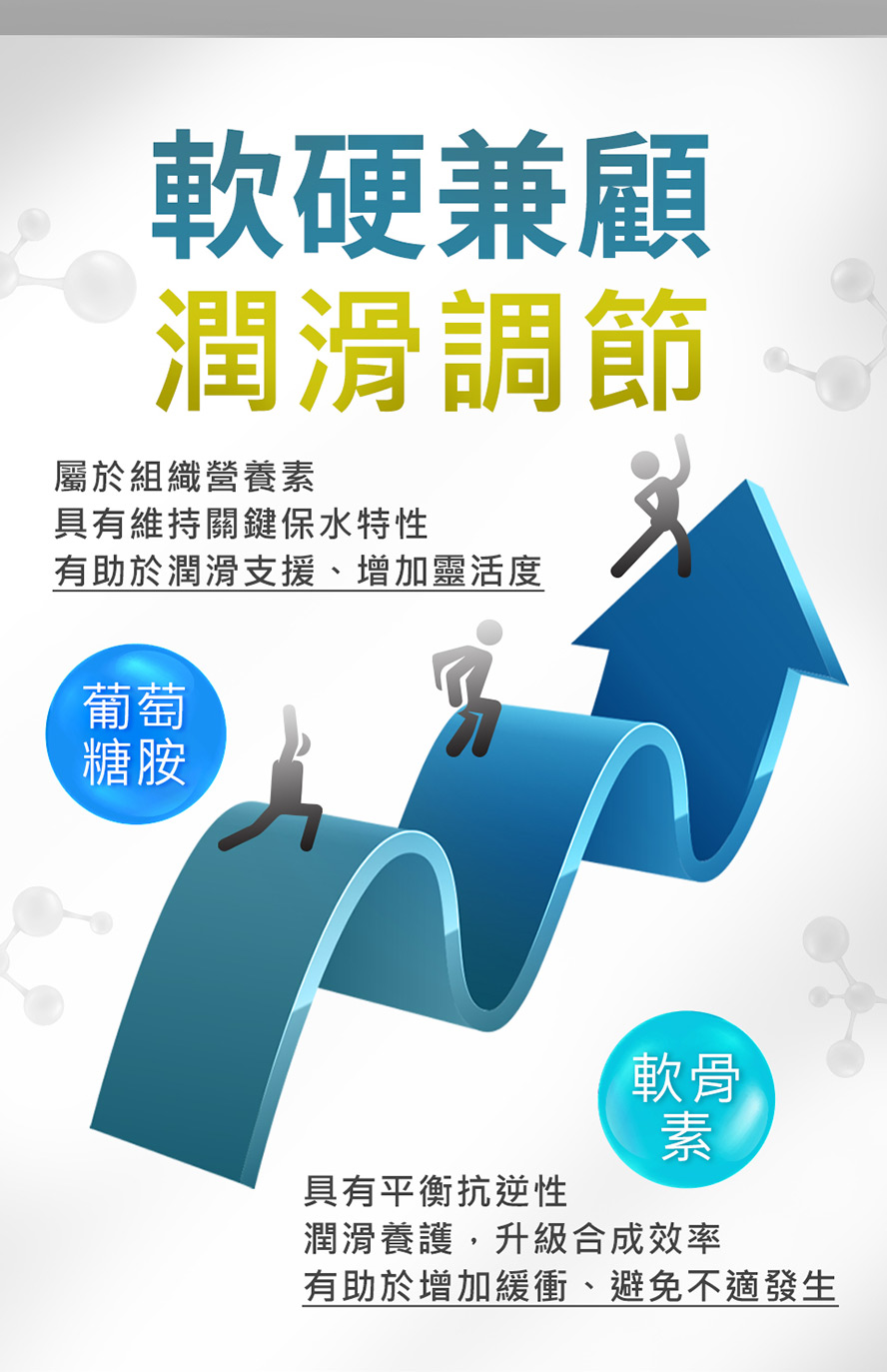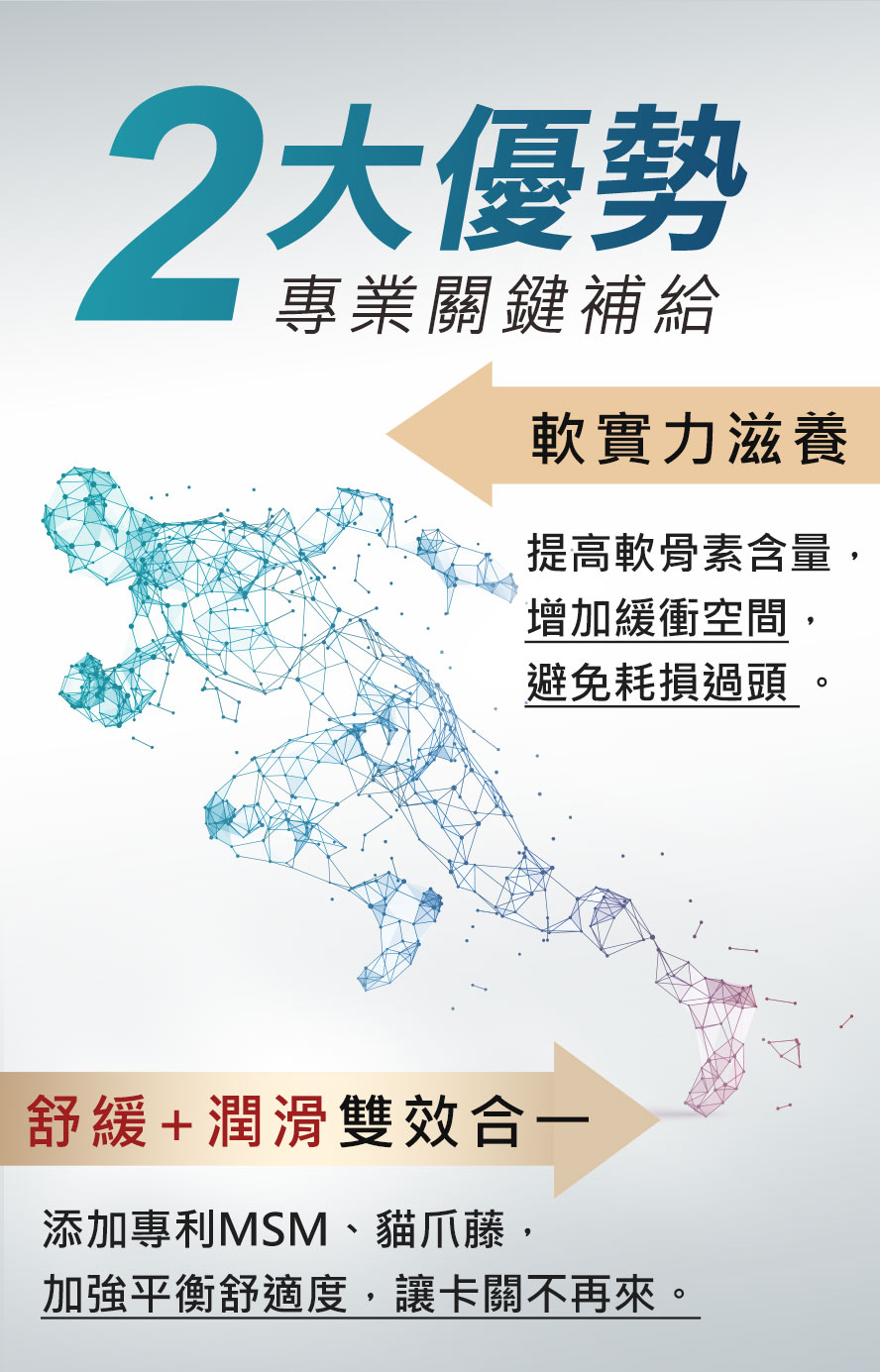 添加【關健三寶】→ 葡萄糖胺、鯊魚軟骨素、專利MSM,